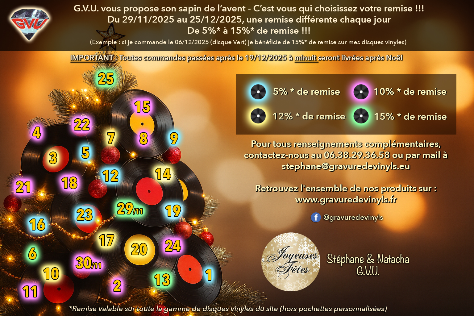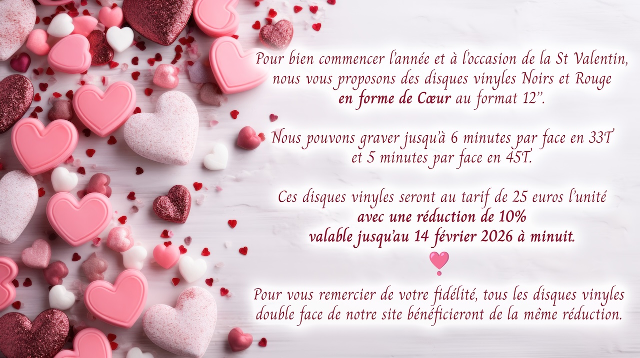 Nous vous offrons la possibilité de graver vos fichiers sonores sur des supports en 7, 10 et 12 pouces, en 33, 45 ou même 78 tours. Nos disques sont en Chlorure de Polyvinyles (PVC) et ont une durée de vie similaire au vinyle que l’on trouve sur le marché du disque.